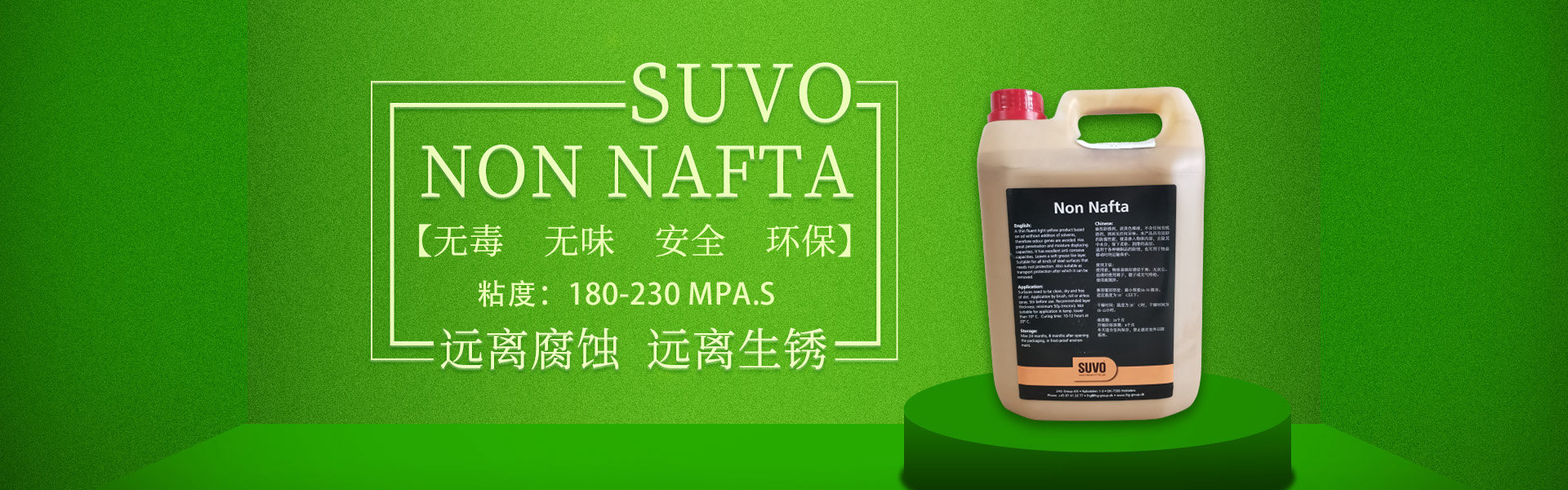 SUVO Non Nafta 是一款無毒、無味、安全、環(huán)保的油基/蠟基防銹產(chǎn)品,不含溶劑,內含超強的防腐劑。 涂刷本產(chǎn)品后,會在被保護的工件表面形成一層80-100微米厚的油脂、蠟基保護膜,保護金屬產(chǎn)品免受惡劣環(huán)境侵害,遠離腐蝕,遠離生銹。 產(chǎn)品適合于鋼鐵制品在陸地存儲或海上運輸過程中的長期防腐,防銹。本產(chǎn)品非常易于被石油精/煤油清洗劑清除,清洗過程不損傷工件表面,不污染施工環(huán)境。